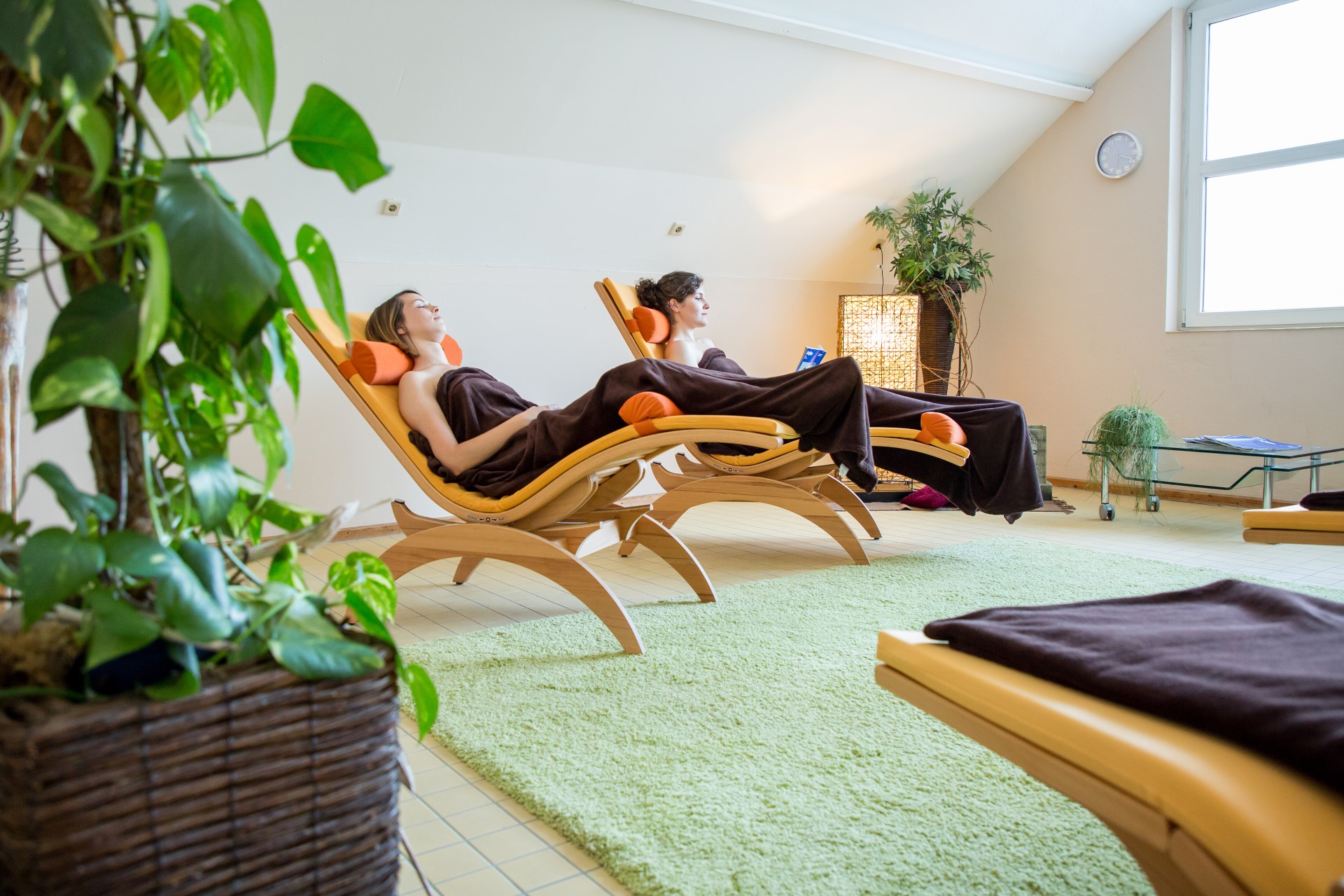 Nach dem Sauna-Gang entspannst du in unserem Relax-Bereich auf einer gemütlichen Liege, eingekuschelt in eine weiche Decke.