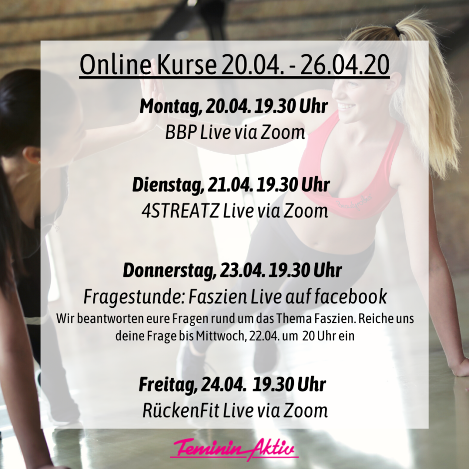 Der Wochenplan der Live-Workouts für die nächste Woche 🙂 Wenn du dabei sein möchtest, sende uns eine kurze Mail an aktion@feminin-aktiv.de , um die Links zu erhalten 🙂 P.S. Reiche uns deine Fragen zum Thema Faszien bis Mittwoch, 22.04. um 20 Uhr ein