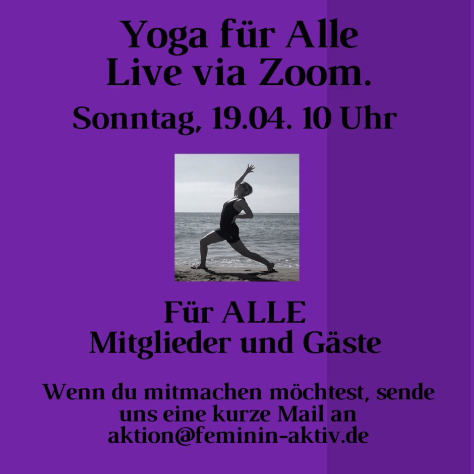 Für einen entspannten Start in den Tag: Die Aufzeichnung des Live-Workouts Yoga für Alle -vom 19.04.20 Wenn du mitmachen bei den nächsten Live-Workouts dabei sein möchtest: Sende uns eine kurze E-Mail an aktion@feminin-aktiv.de , um den Link und die Anleitung für das Live-Workout zu erhalten 🙂 Ganz viel Spaß beim Yogieren! Namasté