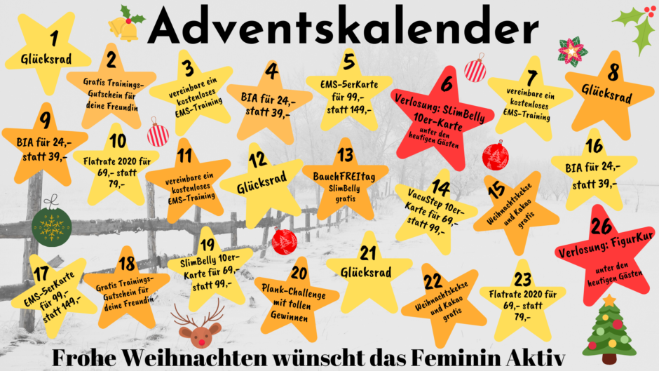 24 Tage, auf die ihr auch freuen dürft! Unser Feminin Aktiv-Adventskalender verkürzt euch das Warten auf Weihnachten mit 24 tollen Überraschungen und Aktionen. Jeden Tag wartet ein ausgewähltes Highlight auf euch. Also verpasst am besten keinen einzigen Tag. Wir freuen uns auf eine schöne gemeinsame Adventszeit! MEHR INFOS UNTER 0541 21116 Du hast noch Fragen?