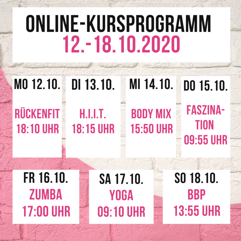 Wir haben für euch diese Woche jeden Tag 2 Kurse die den gesamten Tag zur Verfügung stehen! Egal ob kurz in der Mittagspause oder am entspannt am Abend – wir halten euch fit!