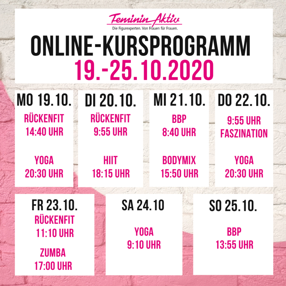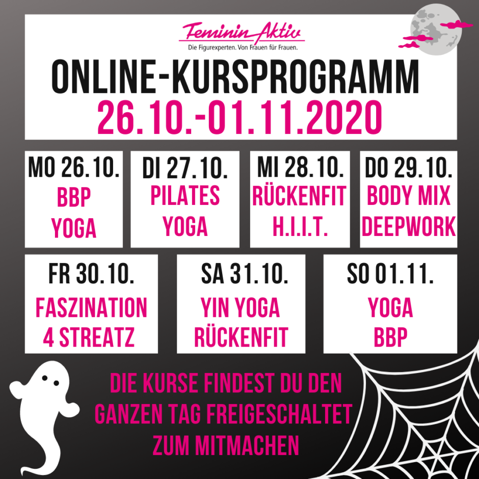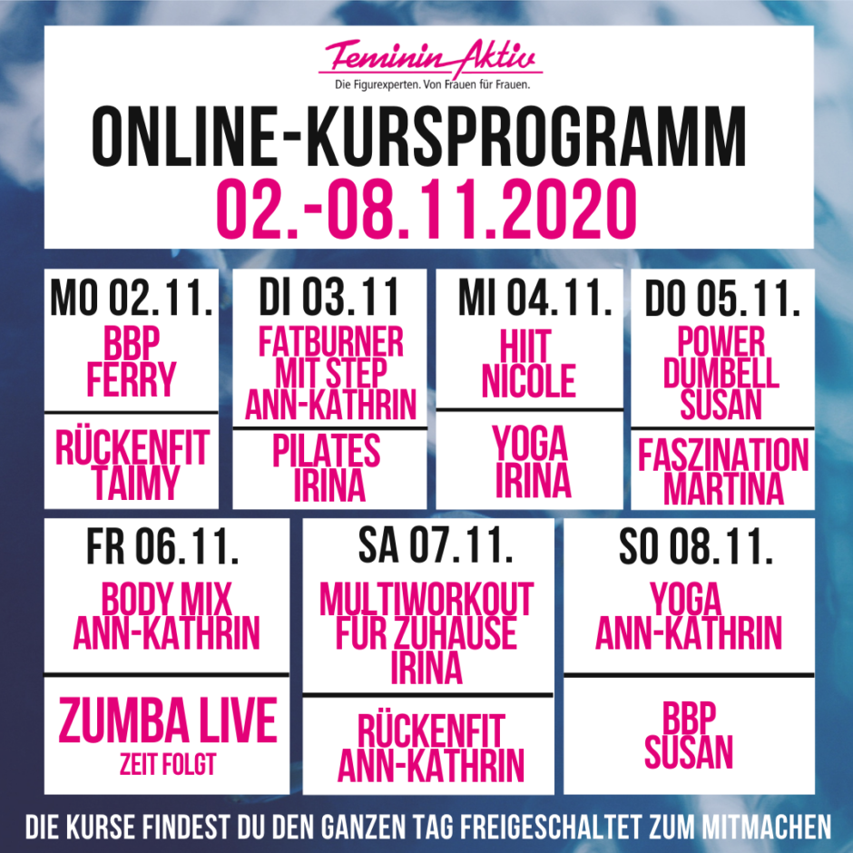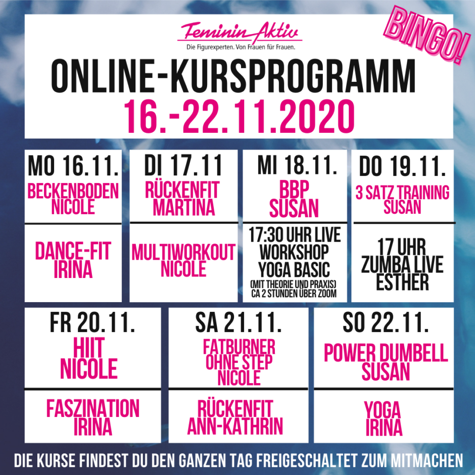 In dieser Woche darfst du dich auf folgende Kurse in unserem Online-Portal freuen. Wenn du dabei sein möchtest, schreibe eine kurze Mail an aktion@feminin-aktiv.de