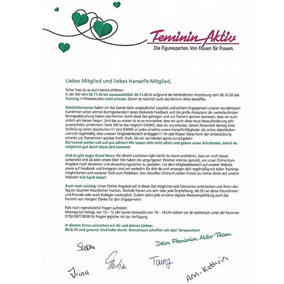 Wichtige Info zur aktuellen Situation: Herzliche Grüße aus dem Feminin Aktiv